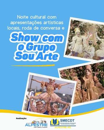 19 horas – Noite Cultural, com apresentações de teatro e música, Coral Eco dos Alpes, Grupo Sou Arte, conversa com escritores locais e visitação às oficinas