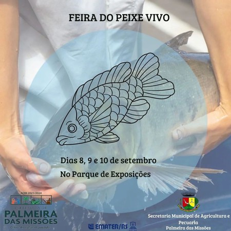 Inicia hoje, 8 de setembro, mais uma edição da Feira do Peixe Vivo de Palmeira das Missões. Evento segue até o dia 10 de setembro, no Parque de Exposições, com a compra de peixes vivos direto do produtor, das 8h30 às 20h.