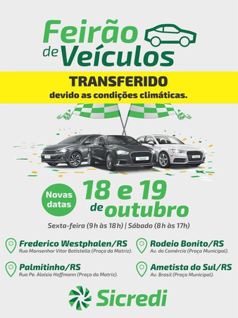 O Feirão de Veículos Sicredi que aconteceria neste final de semana em Palmitinho, Frederico Westphalen, Ametista do Sul e Rodeio Bonito foi transferido devido as condições climáticas previstas para estes dias.