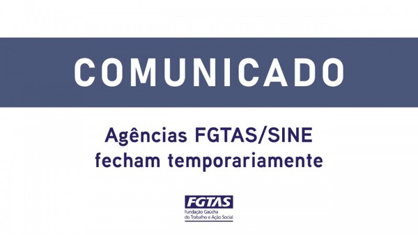 A Fundação Gaúcha do Trabalho e Ação Social (FGTAS) informa a suspensão temporária do atendimento presencial da agências FGTAS/Sine de Frederico Westphalen, devido ao fato de integrantes da equipe testarem positivo para Covid-19. A medida objetiva garantir a segurança, tanto do corpo funcional quanto dos trabalhadores que buscam atendimento nas unidades.
