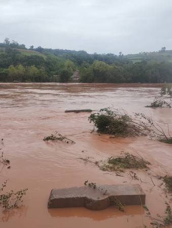 Força do Rio da Várzea leva ponte entre Rodeio Bonito e Ametista do Sul