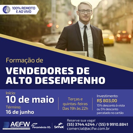 Para desenvolver ainda mais os vendedores de Frederico Westphalen e região, o Senac, em parceria com a AEFW, está oferecendo o curso “Formação de Vendedores de Alto Desempenho”, no formato ao vivo e online.