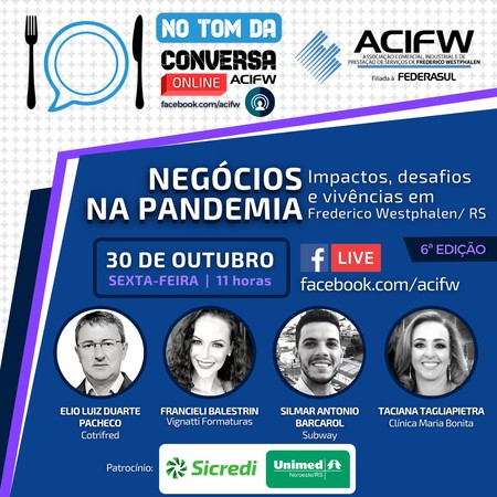A Associação Comercial, Indústrial e de Prestação de Serviço de Frederico Westphalen (ACIFW) se adaptou e reinventou no evento No Tom da Conversa, que por enquanto acontece em formato online on-line, a cada quize dias. O evento chega na sua 6ª edição de maneira remota e tem como objetivo discutir sobre os impactos, desafios e vivências dos negócios na pandemia em uma transmissão ao vivo através do Facebook da entidade. O encontro virtual será realizado na próxima sexta-feira, dia 30 de outubro, às 11h.