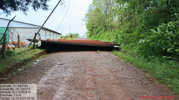Fortes ventos acompanhados de chuva destelharam duas casas e um galpão no interior de Palmeira das Missões durante a madrugada de domingo, 12 de outubro. A Defesa Civil trabalha com a hipótese de microexplosão. Quatro pessoas foram afetadas, mas não houve feridos ou desabrigados.