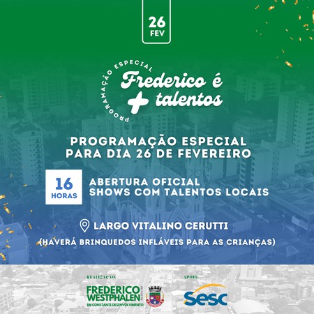 Frederico Westphalen completa, no dia 28 de fevereiro, seus 68 anos. Para comemorar a data, a Administração Municipal promove, no dia 26, o evento “Frederico é + talentos”, com intuito de valorizar os artistas locais e promover um momento de lazer para a comunidade.