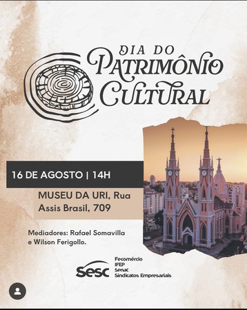 A saída será do Museu Municipal Wülson Jehovah Lütz Farias, anexo à Biblioteca da URI (Rua Assis Brasil, 709). A mediação ficará a cargo de Rafael Somavilla e Wilson Ferigollo, que conduzirão os participantes pela descoberta dos bens materiais e imateriais que ajudam a contar a história do município.