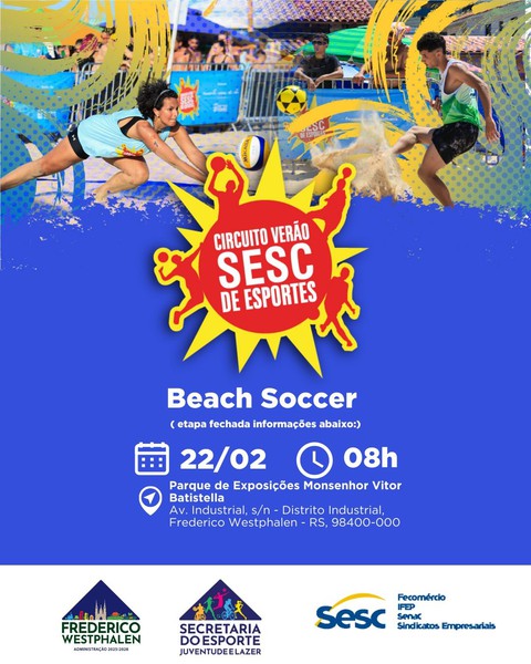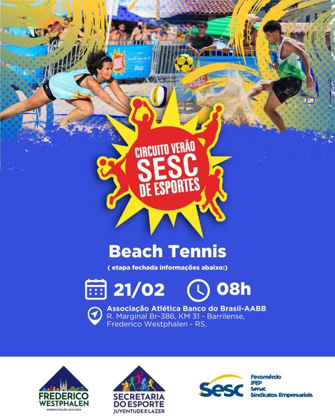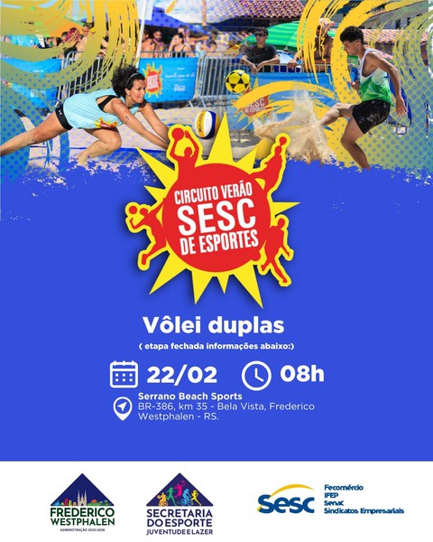 Frederico Westphalen recebe, entre os dias 20 e 22 de fevereiro, a Etapa Frederico Westphalen do Circuito Verão Sesc de Esportes. As competições acontecem a partir das 18h e reúnem atletas e público em uma programação voltada ao esporte e à integração.