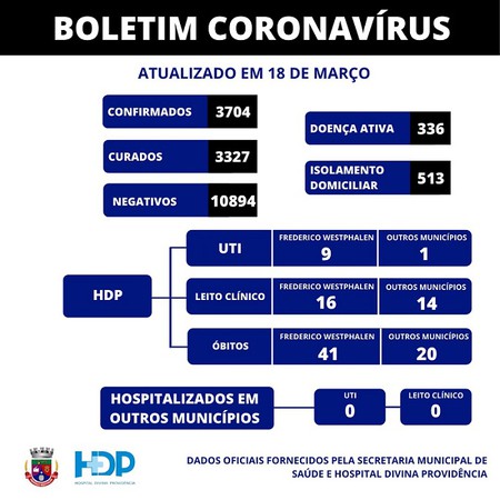 Conforme último boletim epidemiológico divulgado na tarde desta quarta-feira, dia 17, pela Secretaria Municipal de Saúde de Frederico Westphalen e o Hospital Divina Providência, o município registrou mais um óbito por Covid19. A vítima residia no município e estava internada no leito clínico do HDP. Trata-se de um homem de 76 anos de Frederico Westphalen.