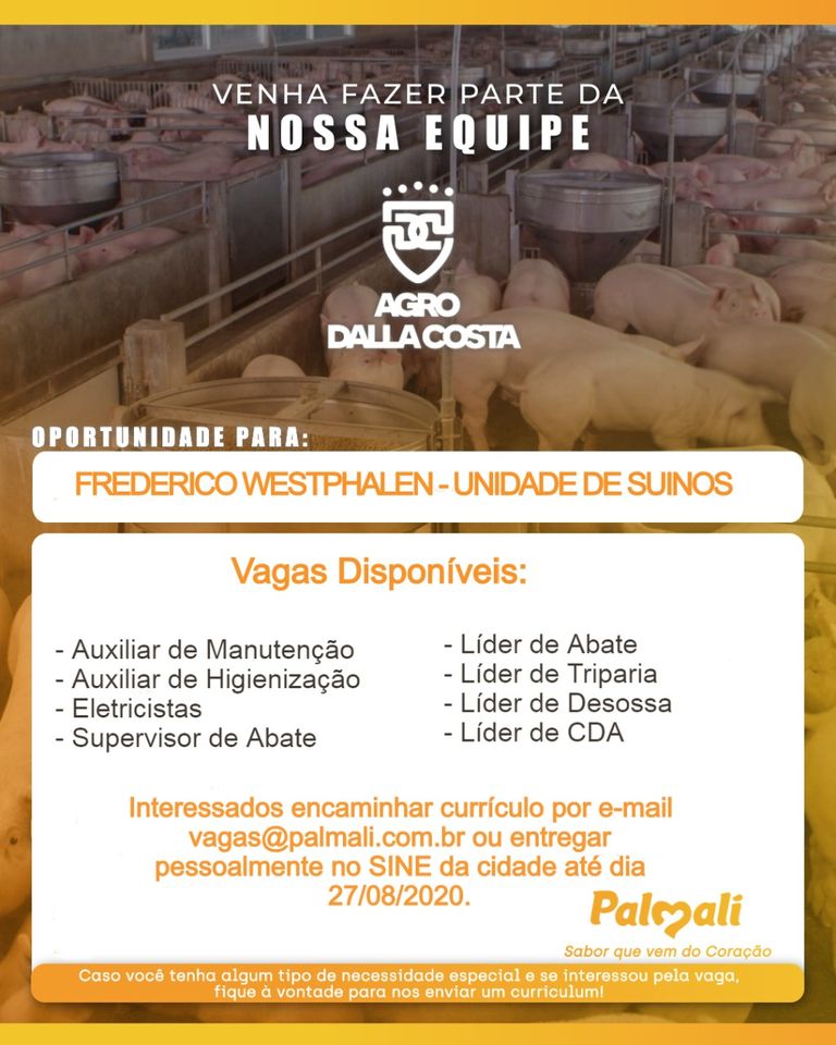 O frigorifico Palmali da Agro Dalla Costa, que assumiu a planta frigorifica de Frederico Westphalen, está com pelo menos oito vagas para cargos específicos em aberto para diversas áreas.