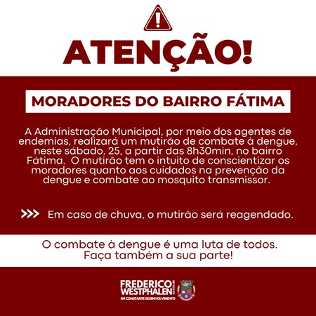 A Administração Municipal, por meio dos agentes de endemias, realizará um mutirão de combate à dengue, neste sábado, 25, a partir das 8h30min, no bairro Fátima. O mutirão tem o intuito de conscientizar os moradores quanto aos cuidados na prevenção da dengue e combate ao mosquito transmissor.