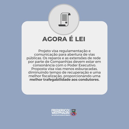 De acordo com o vice-prefeito, João Vendruscolo, autor da proposição, este projeto visa regulamentação e comunicação para abertura de vias públicas. Os reparos e as extensões de rede por parte de companhias devem estar em consonância com o Poder Executivo, sendo que essa proposta visa vias menos esburacadas, diminuindo tempo de recuperação e uma melhor fiscalização por parte dos técnicos, proporcionando uma melhor trafegabilidade aos condutores. “Muitas vezes não somos comunicados da abertura de vala na área urbana, e para ter um serviço mais ágil e conclusivo necessitamos ter essa informação, que temos certeza que as CIas serão nossas parceiras nessa legislação”, destaca Vendruscolo.