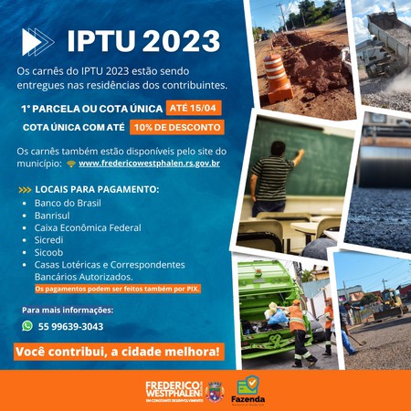 Estão disponíveis os carnês do IPTU 2023 (Imposto Predial e Territorial Urbano) nas casas e estabelecimentos comerciais de Frederico Westphalen. A versão digital do boleto ainda continuará disponível no site www.fredericowestphalen-rs.com.br.