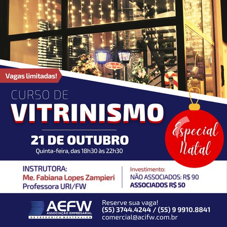 Com o objetivo de atender a demanda apontada em reunião do Núcleo de Desenvolvimento do Comércio, a Associação Empresarial ACI/CDL de FW promoverá uma capacitação para ornamentação e decoração das vitrines, como foco no Frederico em Luz. O curso será ministrado pela professora do curso de Arquitetura e Urbanismo da URI/FW, Me. Fabiana Lopes Zampieri, nesta quinta-feira dia 21 de outubro, com duração de 4 horas. O investimento é de R$90,00 para público geral e R$50,00 para empresas associadas da AEFW, sendo ingressos limitados.