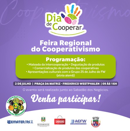 Em comemoração ao dia internacional do Cooperativismo, que anualmente é celebrado no primeiro sábado de julho, o Fórum Regional do Cooperativismo, com apoio da Unidade de Cooperativismo da Emater, estará realizando a Feira Regional do Cooperativismo.