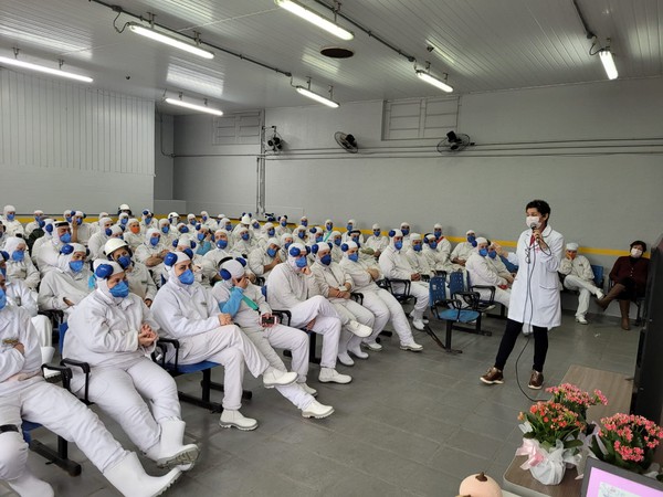 Dezenas de funcionários do Frigorífico Palmali participaram de uma palestra sobre os cuidados com a saúde da mulher. A palestra foi ministrada pela enfermeira Carine Fin.