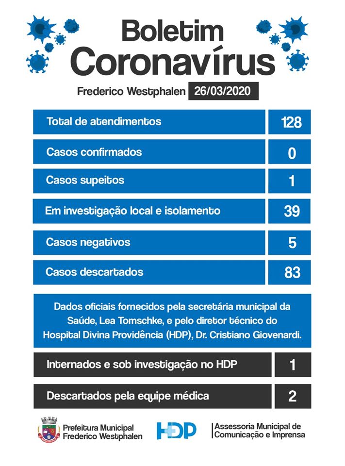 Já foram descartados 83 casos, cinco casos deram resultado negativo e dois casos foram descartados pela equipe médica. Ao todo foram 128 atendimentos no município.