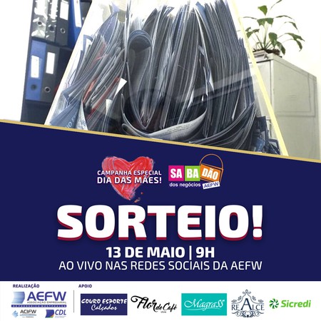 Somente na edição do Dia das Mães, a campanha Sabadão dos Negócios contou com a participação de mais de 70 empresas frederiquenses. A Associação Empresarial ACI/CDL de Frederico Westphalen (AEFW) promove a ação tradicionalmente no segundo sábado de cada mês, em alusão às principais datas comemorativas. Amanhã, dia 13, às 9h, a AEFW irá realizar o sorteio da última edição, com transmissão ao vivo pelas redes sociais da entidade e também através da imprensa local.