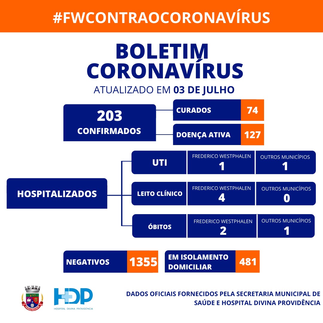O município tem dois óbitos registrados, e dois pacientes internados na UTI do Hospital Divina Providência, um paciente de FW e um de outro município que não foi informado pelo HDP. Quatro pacientes estão internados em leito clínico. Estão em isolamento domiciliar 481 pessoas, dos casos testados 1355 deram negativos.