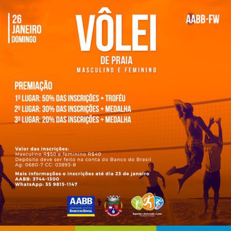 Seguem abertas até quinta-feira, 23 de janeiro, as inscrições para o Torneio de Vôlei de Areia de Duplas Masculino e Feminino. A competição é promovida em parceria entre a Administração Municipal de Frederico Westphalen e Associação Atlética Banco do Brasil (AABB). O torneio será realizado na AABB neste domingo, 26, a partir das 8 horas.