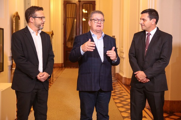 Governador Ranolfo e o secretário da Segurança Pública, Vanius Santarosa, com o novo diretor-geral do DetranRS, Marcelo Soletti