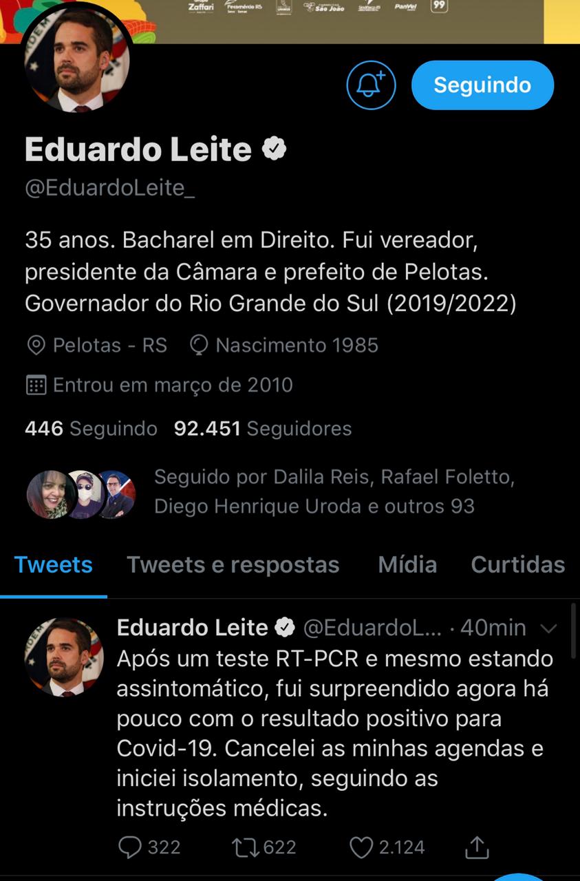 Eduardo Leite confirmou o teste positivo em sua conta no Twitter