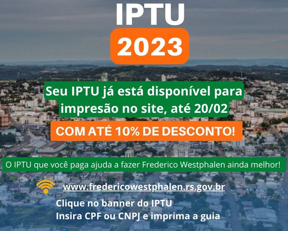 O IPTU é um tributo municipal cobrado anualmente de proprietários de imóveis em zonas urbanas. O imposto é fundamental para o desenvolvimento do município. A partir destes recursos, são realizados investimentos em obras, limpeza, segurança, saúde, educação, transportes e em muitas outras. Ao pagar o IPTU o cidadão contribui para o desenvolvimento de Frederico Westphalen.