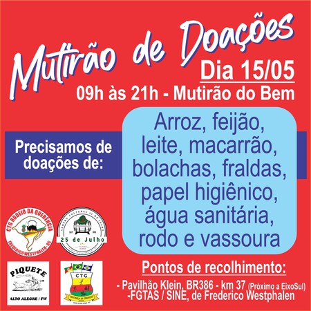 As doações podem ser entregues hoje, 15 de maio, até as 21 horas, no pavilhão Klein, na BR-386, km 37 próximo a Eixo Sul.