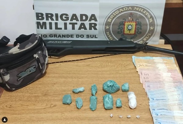 Durante a ação, foram localizadas e apreendidas 10 porções de maconha (33,8 gramas) e quatro pedras de crack (0,6 gramas), além de uma carabina de pressão, uma quantia em dinheiro e dois smartphones.