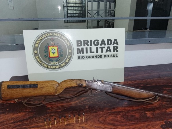 Durante patrulhamento extensivo pela RS-472, próximo ao trevo de acesso à cidade, a guarnição realizou a abordagem de um veículo VW Santana que apresentava excesso de carga. Em busca veicular, foi localizada uma espingarda artesanal calibre .22, sem numeração aparente, além de um pote contendo nove munições do mesmo calibre.