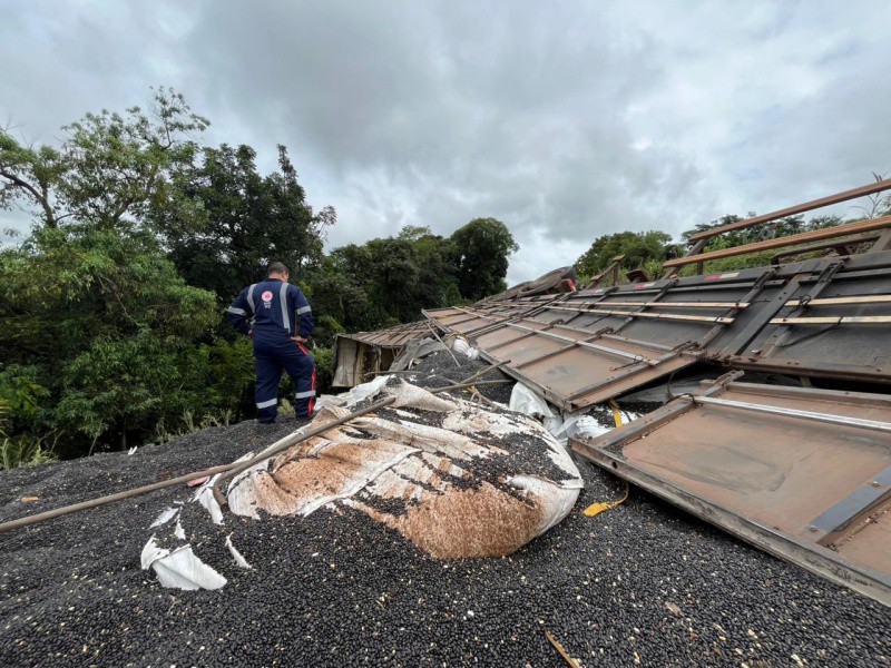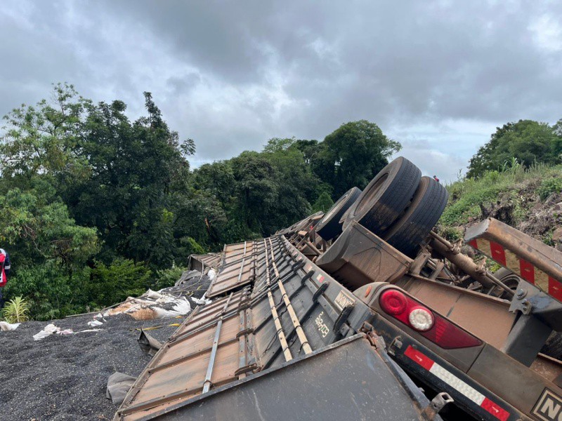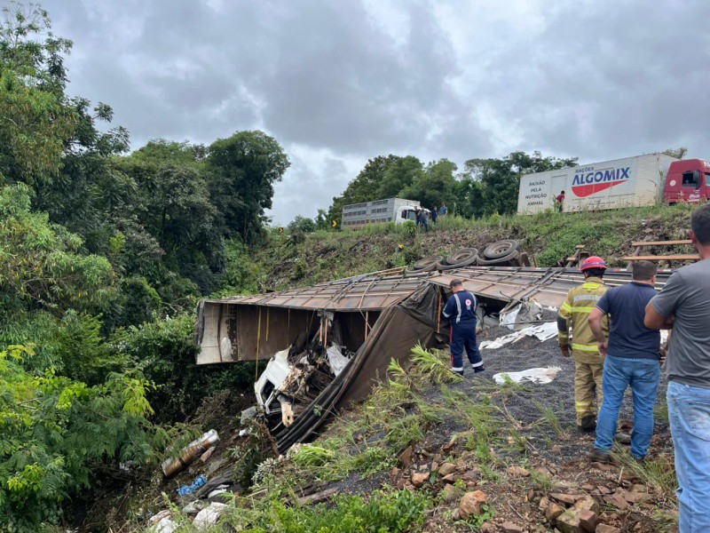 Caminhão bitrem invadiu a pista contrária e caiu em uma ribanceira às margens da BR-386.