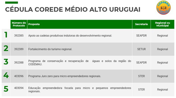 O Governo do Estado homologou nesta semana a cédula da Consulta Popular 2022/2023 da região do Conselho Regional de Desenvolvimento do Médio Alto Uruguai (Codemau).