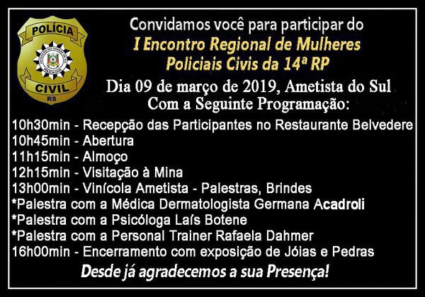 O I Encontro Regional de Mulheres Policiais Civis acontece no próximo dia 09 de março, em Ametista do Sul. O evento inédito no Estado é organizado pelas policiais civis da 14ª Região Policial.