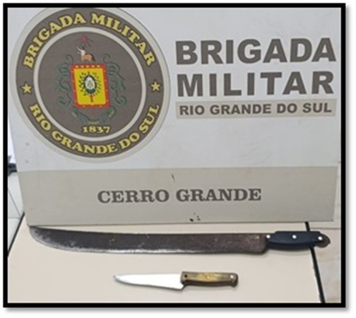 Com o indivíduo, os policiais localizaram e apreenderam duas armas brancas, sendo uma faca e um facão. O material foi recolhido, e o suspeito encaminhado à Delegacia de Polícia para os procedimentos legais.