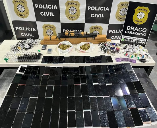 Na tarde desta quinta-feira, 12 de setembro, os Policiais Civis da Draco de Carazinho apreenderam 10Kg de maconha, 200gr de skunk, mais de uma centena de telefones celulares, cabos, carregadores e fones de ouvido.