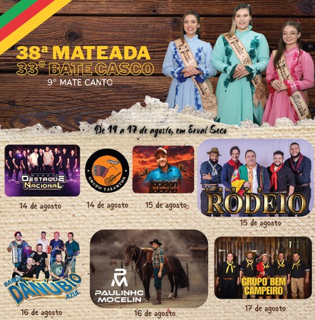 Começou a contagem regressiva para a 38ª edição da Mateada e o 33º Bate-Casco, que serão realizados de 14 a 17 de agosto, na Praça do Imigrante, em Erval Seco. Com entrada gratuita em dois dias da programação, o evento promete atrair milhares de visitantes com shows musicais, atividades culturais e valorização das tradições gaúchas.