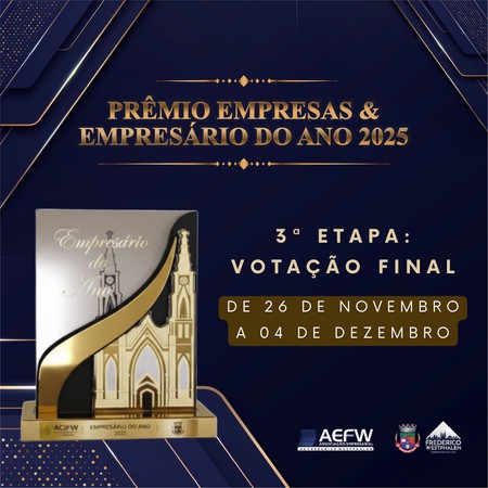 Com o anúncio dos cinco Empresários Destaque 2025, a votação foi iniciada nesta quarta-feira, 26 de novembro, a 3ª Etapa - Votação final que definirá o ganhador do Troféu Catedral – Empresário do Ano 2025. De 26 de novembro a 4 de dezembro, todos os associados poderão participar avaliando individualmente cada um dos finalistas, atribuindo notas de 0 a 5 para os critérios estabelecidos no regulamento.