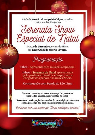 A Administração de Caiçara estará promovendo na próxima segunda-feira,13 de dezembro, a “Serenata Show Especial de Natal”. O evento acontecerá no Lago Otacildo Osório Pivetta, com início às 19 horas.