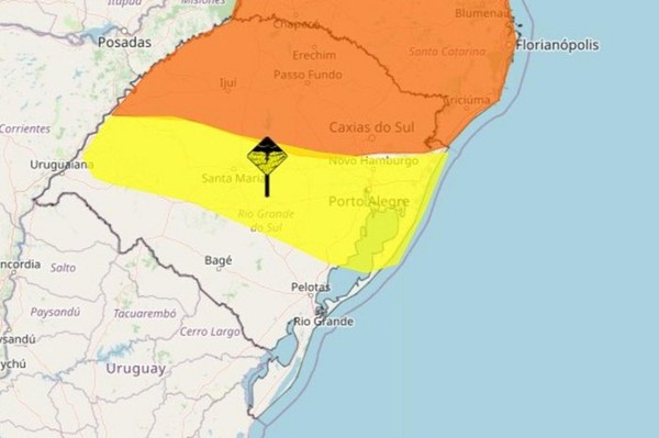 O segundo alerta, laranja, começa às 0h01min de sábado e é válido até às 15h. Ele se estende da metade norte do Estado, em cidades como Caxias do Sul, Erechim, Ijuí, além de outros municípios da Região Sul. Há previsão de chuva entre 30 mm/h e 60 mm/h e vento que varia entre 60 km/h a 100 km/h. Há ainda possibilidade de queda de granizo e alagamentos.