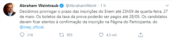 O ministro da Educação, Abraham Weintraub, anunciou a prorrogação do prazo de inscrição para o Exame Nacional do Ensino Médio (Enem) 2020 para a próxima quarta-feira, 27 de maio. Pelo calendário inicial, as datas limite para os estudantes se inscreverem era hoje (22).