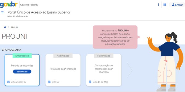As inscrições para a primeira edição do Prouni de 2022 ficam abertas do dia 22 até dia 25 de fevereiro. O estudante pode consultar no site do Prouni – pelo endereço prouni.mec.gov.br – o tipo de bolsa, a modalidade de ensino, o curso, a instituição e o local do campus.