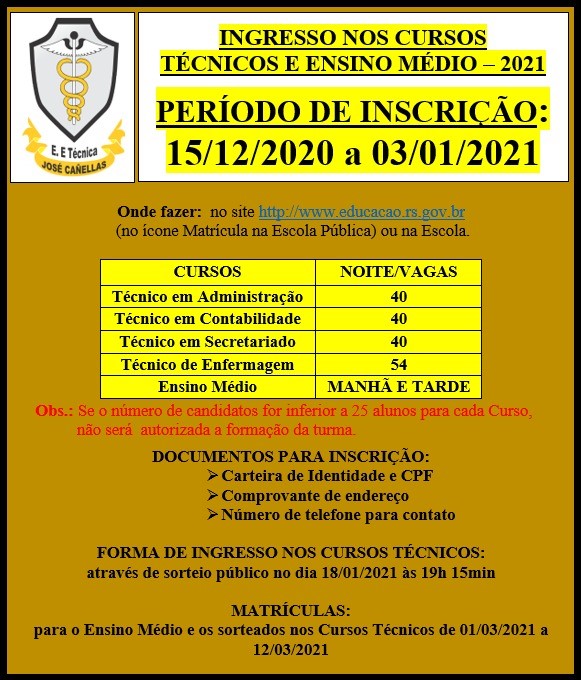 As Inscrições para os Cursos Técnicos e primeiros anos do Ensino Médio da Escola Estadual Técnica José Cañellas de Frederico Westphalen, vão até 3 de janeiro de 2021. São 40 vagas para os cursos de Técnico em Administração, Contabilidade e Secretariado e 54 vagas para o Curso Técnico de Enfermagem. As inscrições são gratuitas e podem ser feitas pelo site www.educacao.rs.gov.br ou presencialmente na escola.