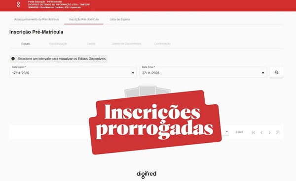 A Secretaria Municipal de Educação e Cultura (SMEC) de Frederico Westphalen informa que o período de inscrições para vagas na rede municipal foi prorrogado até esta quinta-feira, dia 27 de novembro.
