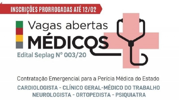 A Secretaria de Planejamento, Orçamento e Gestão (Seplag) prorrogou o período de inscrições para contratação emergencial de 14 médicos que atuarão no Departamento de Perícia Médica e Saúde do Trabalhador (Dmest). Conforme edital publicado na edição do Diário Oficial do Estado (DOE) desta quarta-feira (22/1), o prazo aos candidatos interessados agora vai até 12 de fevereiro.