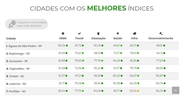 O índice criado pela empresa Aquila, aponta qual a situação atual do município e classifica como IGMA - excelente, desenvolvido, em desenvolvimento ou crítico. A partir desta análise, o gestor terá uma visão ampla da sua cidade, sendo possível rever inclusive a destinação da aplicação dos seus recursos públicos.