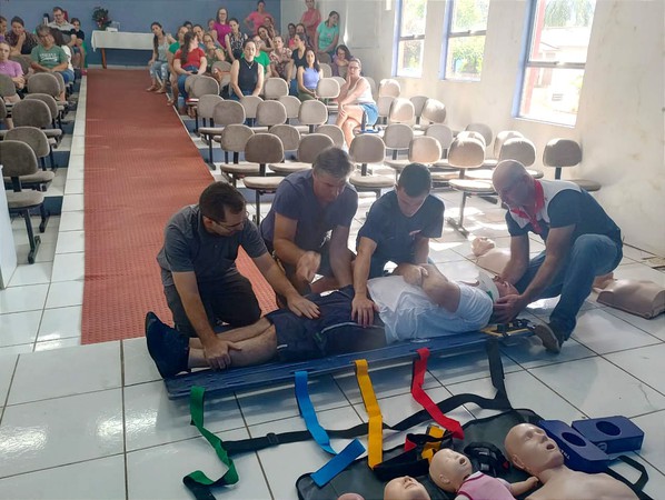 A palestra em primeiros socorros foi ministrada pelo enfermeiro, Luan Post, e pelo técnico de enfermagem, Cleber Dalla Nora, ambos com experiência em pronto atendimento.