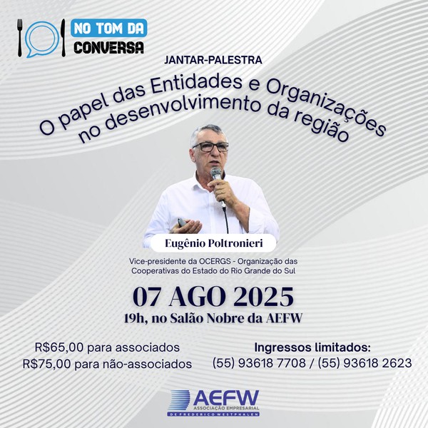 Mais uma edição do No Tom da Conversa está chegando. O tradicional jantar-palestra promovido pela Associação Empresarial ACI/CDL de Frederico Westphalen (AEFW) será realizado na quinta-feira, 7 de agosto, às 19 horas, no Salão Nobre da entidade. Para esta edição, a diretoria da AEFW convidou o vice-presidente da Organização das Cooperativas do Estado do Rio Grande do Sul (OCERGS), Eugênio Poltronieri para falar sobre o papel das entidades e organizações no desenvolvimento da região.