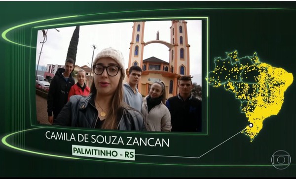Acompanhada por cinco amigos, a jovem de Palmitinho Camila de Souza Zancan foi destaque no quadro “O Brasil que eu quero”, exibido pela Rede Globo. A emissora apresenta nos últimos meses mensagens de brasileiros falando o que desejam para o futuro do Brasil.
