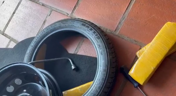 Durante a inspeção, os agentes realizaram a fiscalização e constataram quantidade de maconha escondida dentro do estepe e dentro da mochila do condutor, totalizando 5,6 kg da droga.