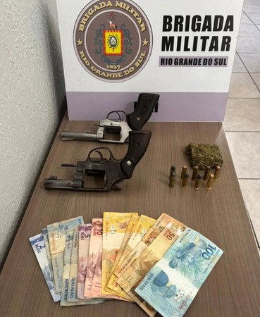 A prisão foi realizada após abordagem veicular a um gol branco, onde em seu interior foi localizado e apreendido, dois revólveres calibre 38, nove munições, 57 gramas de maconha e R$ 295,00 reais.