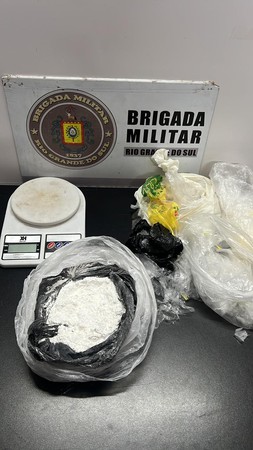 Durante a abordagem, os policiais apreenderam uma sacola plástica com 551 gramas de cocaína, uma balança de precisão e materiais utilizados para embalar entorpecentes.